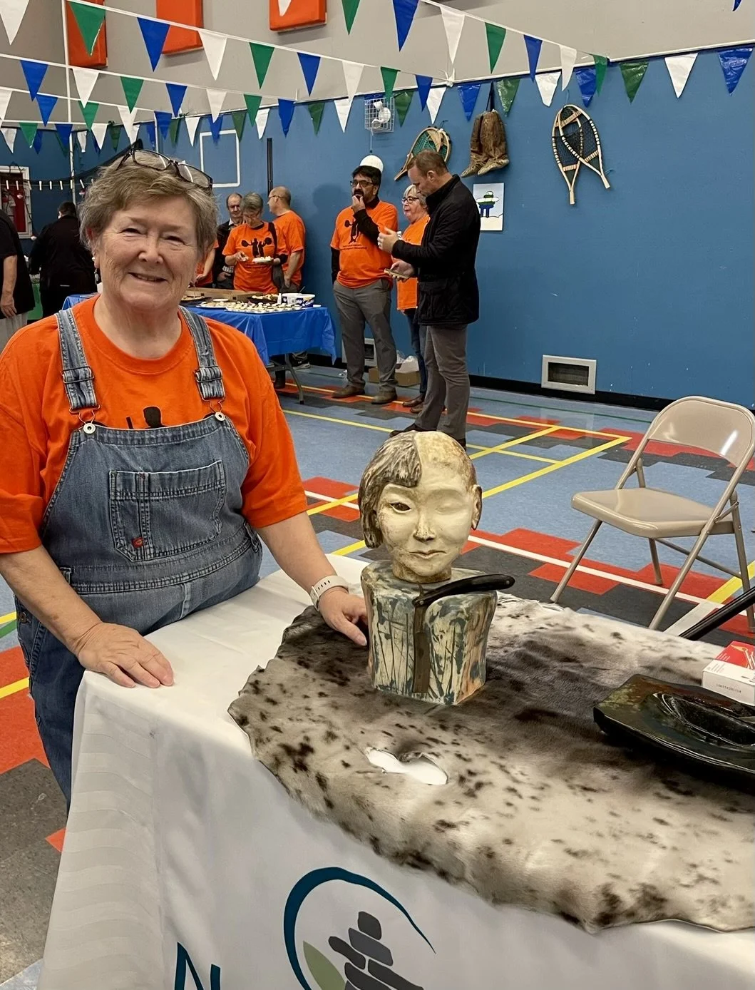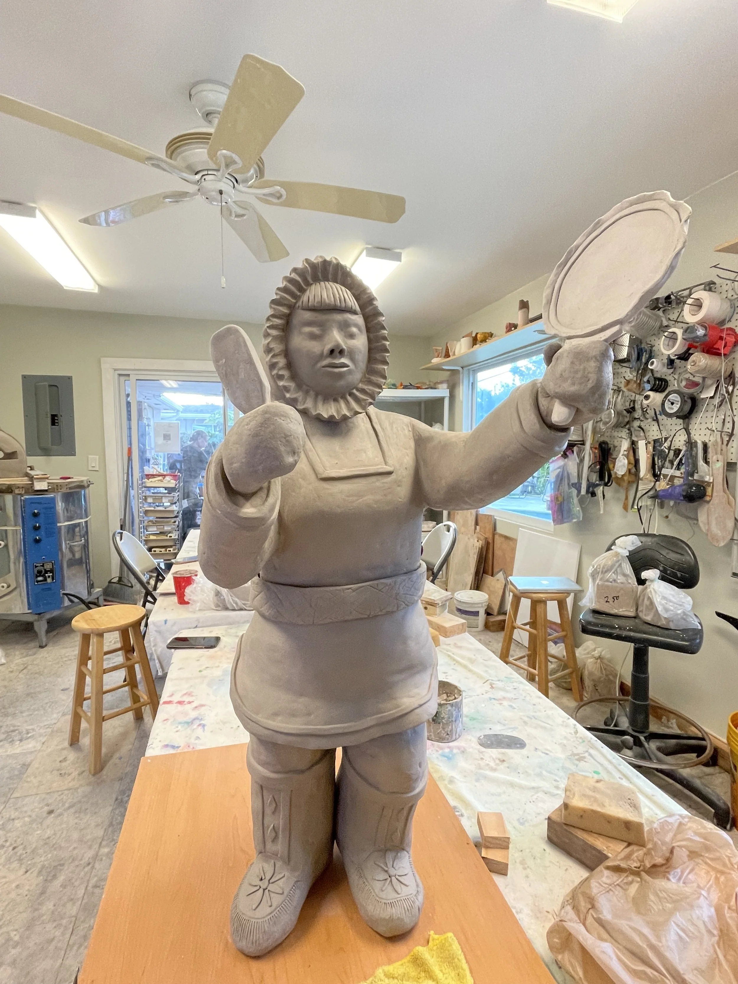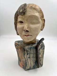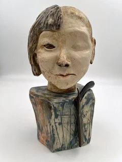 Description: Jane, my Inuk mother was born in Labrador in 1927. At age six she was taken from her parents and sent to an Inuit Residential School called Lockwood. Those schools were set up to “take the savage out of them.” On her first day there her head was shaved, not because of lice but shaving a person’s head takes away their identity. Mom’s first job at the residential dorm was to skim the maggots that rose to the top of the boiling water as their food was being cooked. There “they created a wound deeper than midnight and darker than blue. All throughout her life she relived the memories trapped in her brain. There she learned the rules for the hungry and rules that were cruel. The trauma was carried down through the years.” Excerpts from a song for our mom written and performed by my brother Kirk Lethbridge. Album. “Ghost in my Window.” This sculpture has been very healing for me, her daughter.